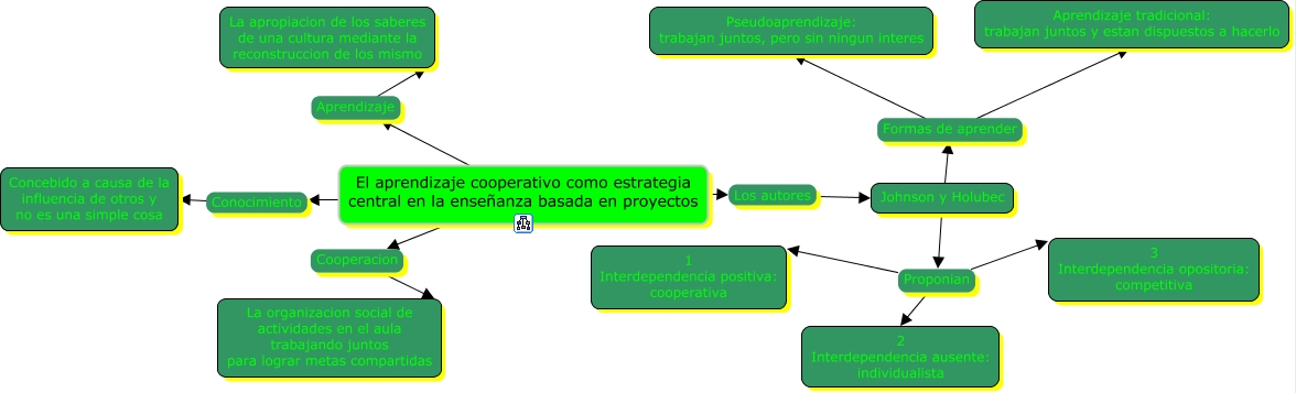 Este Cmap, tiene información relacionada con: C2-S4-El aprendizaje, Johnson y Holubec Proponian 1 Interdependencia positiva: cooperativa, Johnson y Holubec Formas de aprender Aprendizaje tradicional: trabajan juntos y estan dispuestos a hacerlo, El aprendizaje cooperativo como estrategia central en la enseñanza basada en proyectos Aprendizaje La apropiacion de los saberes de una cultura mediante la reconstruccion de los mismo, El aprendizaje cooperativo como estrategia central en la enseñanza basada en proyectos Conocimiento Concebido a causa de la influencia de otros y no es una simple cosa, Johnson y Holubec Formas de aprender Pseudoaprendizaje: trabajan juntos, pero sin ningun interes, El aprendizaje cooperativo como estrategia central en la enseñanza basada en proyectos Cooperacion La organizacion social de actividades en el aula trabajando juntos para lograr metas compartidas, Johnson y Holubec Proponian 2 Interdependencia ausente: individualista, El aprendizaje cooperativo como estrategia central en la enseñanza basada en proyectos Los autores Johnson y Holubec, Johnson y Holubec Proponian 3 Interdependencia opositoria: competitiva