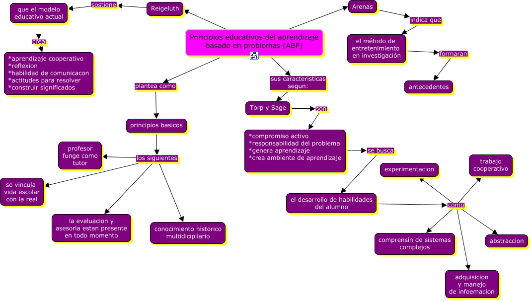 Este Cmap, tiene información relacionada con: C3-S1-Principios, Principios educativos del aprendizaje basado en problemas (ABP) Arenas, Reigeluth sostiene que el modelo educativo actual, Principios educativos del aprendizaje basado en problemas (ABP) sus caracteristicas segun: Torp y Sage, principios basicos los siguientes se vincula vida escolar con la real, el desarrollo de habilidades del alumno como trabajo cooperativo, principios basicos los siguientes conocimiento historico multidicipliario, el desarrollo de habilidades del alumno como adquisicion y manejo de infoemacion, Arenas indica que el método de entretenimiento en investigación, el desarrollo de habilidades del alumno como experimentacion, *compromiso activo *responsabilidad del problema *genera aprendizaje *crea ambiente de aprendizaje se busca el desarrollo de habilidades del alumno, Principios educativos del aprendizaje basado en problemas (ABP) plantea como principios basicos, el desarrollo de habilidades del alumno como abstraccion, que el modelo educativo actual crea *aprendizaje cooperativo *reflexion *habilidad de comunicacon *actitudes para resolver *construir significados, el desarrollo de habilidades del alumno como comprensin de sistemas complejos, principios basicos los siguientes la evaluacion y asesoria estan presente en todo momento, Principios educativos del aprendizaje basado en problemas (ABP) Reigeluth, principios basicos los siguientes profesor funge como tutor, el método de entretenimiento en investigación formaran antecedentes, Torp y Sage son *compromiso activo *responsabilidad del problema *genera aprendizaje *crea ambiente de aprendizaje