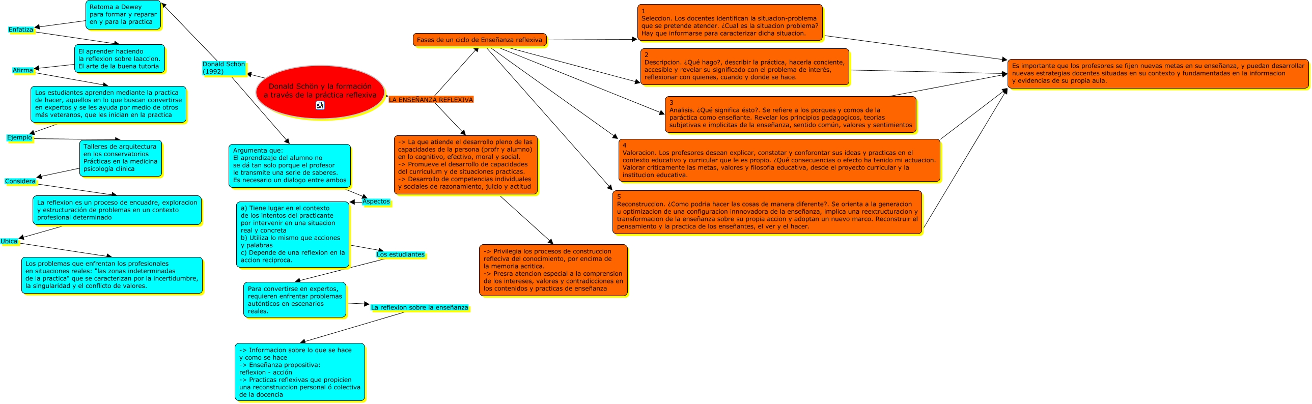 Este Cmap, tiene información relacionada con: C1-S2-Donald, Donald Schön y la formación a través de la práctica reflexiva Donald Schön (1992) Retoma a Dewey para formar y reparar en y para la practica, 1 Seleccion. Los docentes identifican la situacion-problema que se pretende atender. ¿Cual es la situacion problema? Hay que informarse para caracterizar dicha situacion. Es importante que los profesores se fijen nuevas metas en su enseñanza, y puedan desarrollar nuevas estrategias docentes situadas en su contexto y fundamentadas en la informacion y evidencias de su propia aula., 2 Descripcion. ¿Qué hago?, describir la práctica, hacerla conciente, accesible y revelar su significado con el problema de interés, reflexionar con quienes, cuando y donde se hace. Es importante que los profesores se fijen nuevas metas en su enseñanza, y puedan desarrollar nuevas estrategias docentes situadas en su contexto y fundamentadas en la informacion y evidencias de su propia aula., Fases de un ciclo de Enseñanza reflexiva 1 Seleccion. Los docentes identifican la situacion-problema que se pretende atender. ¿Cual es la situacion problema? Hay que informarse para caracterizar dicha situacion., Fases de un ciclo de Enseñanza reflexiva 2 Descripcion. ¿Qué hago?, describir la práctica, hacerla conciente, accesible y revelar su significado con el problema de interés, reflexionar con quienes, cuando y donde se hace., Retoma a Dewey para formar y reparar en y para la practica Enfatiza El aprender haciendo la reflexion sobre laaccion. El arte de la buena tutoria, a) Tiene lugar en el contexto de los intentos del practicante por intervenir en una situacion real y concreta b) Utiliza lo mismo que acciones y palabras c) Depende de una reflexion en la accion reciproca. Los estudiantes Para convertirse en expertos, requieren enfrentar problemas auténticos en escenarios reales., 3 Analisis. ¿Qué significa ésto?. Se refiere a los porques y comos de la paráctica como enseñante. Revelar los principios pedagogicos, teorias subjetivas e implicitas de la enseñanza, sentido común, valores y sentimientos Es importante que los profesores se fijen nuevas metas en su enseñanza, y puedan desarrollar nuevas estrategias docentes situadas en su contexto y fundamentadas en la informacion y evidencias de su propia aula., 5 Reconstruccion. ¿Como podria hacer las cosas de manera diferente?. Se orienta a la generacion u optimizacion de una configuracion innnovadora de la enseñanza, implica una reextructuracion y transformacion de la enseñanza sobre su propia accion y adoptan un nuevo marco. Reconstruir el pensamiento y la practica de los enseñantes, el ver y el hacer. Es importante que los profesores se fijen nuevas metas en su enseñanza, y puedan desarrollar nuevas estrategias docentes situadas en su contexto y fundamentadas en la informacion y evidencias de su propia aula., Donald Schön y la formación a través de la práctica reflexiva LA ENSEÑANZA REFLEXIVA -> La que atiende el desarrollo pleno de las capacidades de la persona (profr y alumno) en lo cognitivo, efectivo, moral y social. -> Promueve el desarrollo de capacidades del curriculum y de situaciones practicas. -> Desarrollo de competencias individuales y sociales de razonamiento, juicio y actitud, Fases de un ciclo de Enseñanza reflexiva 3 Analisis. ¿Qué significa ésto?. Se refiere a los porques y comos de la paráctica como enseñante. Revelar los principios pedagogicos, teorias subjetivas e implicitas de la enseñanza, sentido común, valores y sentimientos, 4 Valoracion. Los profesores desean explicar, constatar y conforontar sus ideas y practicas en el contexto educativo y curricular que le es propio. ¿Qué consecuencias o efecto ha tenido mi actuacion. Valorar criticamente las metas, valores y filosofia educativa, desde el proyecto curricular y la institucion educativa. Es importante que los profesores se fijen nuevas metas en su enseñanza, y puedan desarrollar nuevas estrategias docentes situadas en su contexto y fundamentadas en la informacion y evidencias de su propia aula., Argumenta que: El aprendizaje del alumno no se dá tan solo porque el profesor le transmite una serie de saberes. Es necesario un dialogo entre ambos Aspectos a) Tiene lugar en el contexto de los intentos del practicante por intervenir en una situacion real y concreta b) Utiliza lo mismo que acciones y palabras c) Depende de una reflexion en la accion reciproca., Para convertirse en expertos, requieren enfrentar problemas auténticos en escenarios reales. La reflexion sobre la enseñanza -> Informacion sobre lo que se hace y como se hace -> Enseñanza propositiva: reflexion - acción -> Practicas reflexivas que propicien una reconstruccion personal ó colectiva de la docencia, -> La que atiende el desarrollo pleno de las capacidades de la persona (profr y alumno) en lo cognitivo, efectivo, moral y social. -> Promueve el desarrollo de capacidades del curriculum y de situaciones practicas. -> Desarrollo de competencias individuales y sociales de razonamiento, juicio y actitud -> Privilegia los procesos de construccion refleciva del conocimiento, por encima de la memoria acritica. -> Presra atencion especial a la comprension de los intereses, valores y contradicciones en los contenidos y practicas de enseñanza, Donald Schön y la formación a través de la práctica reflexiva Donald Schön (1992) Argumenta que: El aprendizaje del alumno no se dá tan solo porque el profesor le transmite una serie de saberes. Es necesario un dialogo entre ambos, El aprender haciendo la reflexion sobre laaccion. El arte de la buena tutoria Afirma Los estudiantes aprenden mediante la practica de hacer, aquellos en lo que buscan convertirse en expertos y se les ayuda por medio de otros más veteranos, que les inician en la practica, Los estudiantes aprenden mediante la practica de hacer, aquellos en lo que buscan convertirse en expertos y se les ayuda por medio de otros más vetera