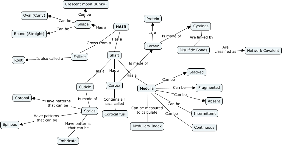 This Concept Map, created with IHMC CmapTools, has information related to: Hair Structure Map, Shaft Has a Cortex, Medulla Can be measured to calculate Medullary Index, Follicle Is also called a Root, Keratin Is made of Cystines, Medulla Can be Absent, Medulla Can be Continuous, Medulla Can be Intermittent, Cortex Contains air sacs called Cortical fusi, HAIR Grows from a Follicle, Medulla Can be Stacked, Shaft Has a Cuticle, Shape Can be Crescent moon (Kinky), Shaft Has a Medulla, Medulla Can be Fragmented, Disulfide Bonds Are classified as Network Covalent, Scales Have patterns that can be Imbricate, Scales Have patterns that can be Spinous, Shape Can be Round (Straight), Shape Can be Oval (Curly), Cuticle Is made of Scales