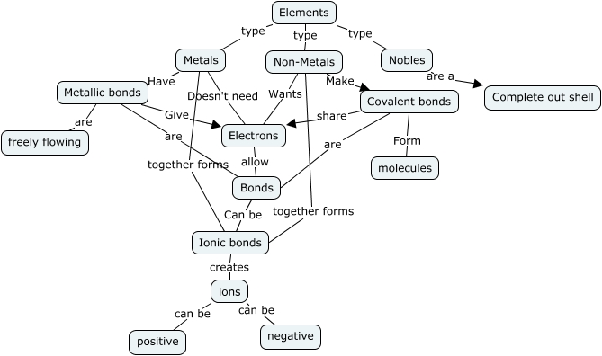 This Concept Map, created with IHMC CmapTools, has information related to: 12-8-17 Lesson's Cmap, Ionic bonds creates ions, Metals Doesn't need Electrons, Covalent bonds are Bonds, Nobles are a Complete out shell, Non-Metals Wants Electrons, Bonds Can be Ionic bonds, Metals together forms Ionic bonds, Metallic bonds Give Electrons, Covalent bonds Form molecules, Metallic bonds are freely flowing, Elements type Metals, Non-Metals together forms Ionic bonds, Elements type Non-Metals, Elements type Nobles, Metallic bonds are Bonds, Electrons allow Bonds, Metals Have Metallic bonds, ions can be positive, ions can be negative, Covalent bonds share Electrons