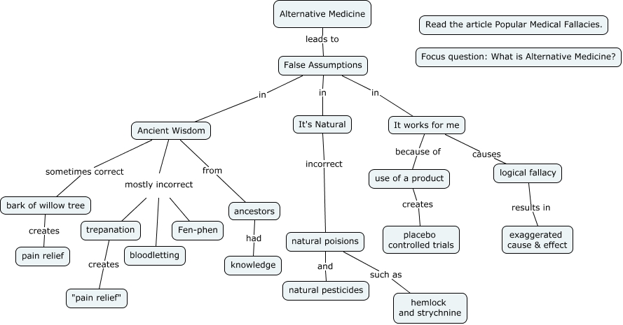 This Concept Map, created with IHMC CmapTools, has information related to: Alternative Medicine SkepDoc, It works for me because of use of a product, natural poisions such as hemlock and strychnine, Ancient Wisdom mostly incorrect trepanation, bark of willow tree creates pain relief, Ancient Wisdom from ancestors, Ancient Wisdom mostly incorrect Fen-phen, Alternative Medicine leads to False Assumptions, logical fallacy results in exaggerated cause & effect, Ancient Wisdom sometimes correct bark of willow tree, ancestors had knowledge, natural poisions and natural pesticides, False Assumptions in Ancient Wisdom, False Assumptions in It works for me, It works for me causes logical fallacy, False Assumptions in It's Natural, trepanation creates "pain relief", Ancient Wisdom mostly incorrect bloodletting, It's Natural incorrect natural poisions, use of a product creates placebo controlled trials