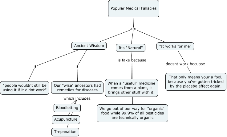 This Concept Map, created with IHMC CmapTools, has information related to: SkepDoc Cmap, Popular Medical Fallacies are Ancient Wisdom, Ancient Wisdom is "people wouldnt still be using it if it didnt work", Our "wise" ancestors had remedies for diseases which includes Trepanation, Popular Medical Fallacies are "It works for me", Our "wise" ancestors had remedies for diseases which includes Bloodletting, "It works for me" doesnt work becuase That only means your a fool, because you've gotten tricked by the placebo effect again., It's "Natural" is fake because When a "useful" medicine comes from a plant, it brings other stuff with it, It's "Natural" is fake because We go out of our way for "organic" food while 99.9% of all pesticides are technically organic, Ancient Wisdom is Our "wise" ancestors had remedies for diseases, Popular Medical Fallacies are It's "Natural", Our "wise" ancestors had remedies for diseases which includes Acupuncture