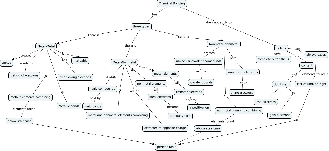 This Concept Map, created with IHMC CmapTools, has information related to: Chemical Bonding, molecular covalent compounds held by covalent bonds, Nonmetal-Nonmetal both want more electrons, want more electrons has to share electrons, Metal-Metal has free flowing electrons, metal elecments combining elements found below stair case, nobles have complete outer shells, metal elements will transfer electrons, nobles are content, Metal-Nonmetal is metal and nonmetal elements combining, content and don't want, nobles are always gases, Chemical Bonding has three types, Nonmetal-Nonmetal is nonmetal elements combining, Metal-Nonmetal will be attracted to opposite charge, transfer electrons become a positive ion, always gases elements found in last column on right, don't want to gain electrons, three types there is Metal-Nonmetal, above stair case in periotic table, three types there is Nonmetal-Nonmetal