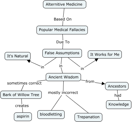 This Concept Map, created with IHMC CmapTools, has information related to: Alternative Medicine, False Assumptions in It's Natural, Ancestors had Knowledge, False Assumptions in It Works for Me, False Assumptions in Ancient Wisdom, Bark of Willow Tree creates aspirin, Popular Medical Fallacies Due To False Assumptions, Ancient Wisdom mostly incorrect Trepanation, Alternitive Medicine Based On Popular Medical Fallacies, Ancient Wisdom sometimes correct Bark of Willow Tree, Ancient Wisdom mostly incorrect bloodletting, Ancient Wisdom from Ancestors
