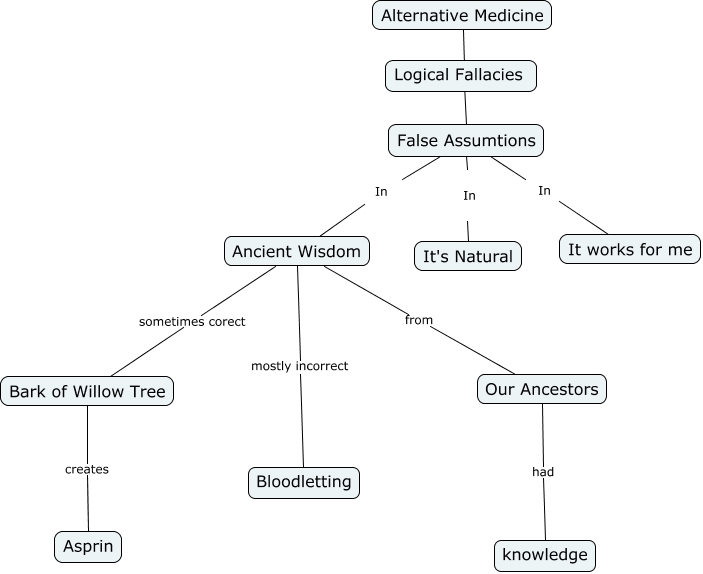 This Concept Map, created with IHMC CmapTools, has information related to: Medical Fallacies C-Map, False Assumtions In It's Natural, False Assumtions In It works for me, Our Ancestors had knowledge, Ancient Wisdom sometimes corect Bark of Willow Tree, Ancient Wisdom mostly incorrect Bloodletting, Ancient Wisdom from Our Ancestors, False Assumtions In Ancient Wisdom, Alternative Medicine False Assumtions, Bark of Willow Tree creates Asprin