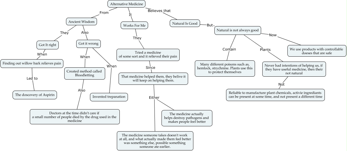 This Concept Map, created with IHMC CmapTools, has information related to: Untitled 1, Created method called Bloodletting Also Doctors at the time didn't care if a small number of people died by the drug used in the medicine, Got it wrong When Invented trepanation, Ancient Wisdom They Got It right, Ancient Wisdom Also Got it wrong, Natural is not always good Now We use products with controllable doeses that are safe, Natural is not always good Contain Many different poisons such as, hemlock, strychnine. Plants use this to protect themselves, Alternative Medicine From Ancient Wisdom, Finding out willow bark relieves pain Led to The doscovery of Aspirin, Natural Is Good But Natural is not always good, Got It right When Finding out willow bark relieves pain, Tried a medicine of some sort and it relieved their pain Since That medicine helped them, they belive it will keep on helping them., Works For Me They Tried a medicine of some sort and it relieved their pain, Alternative Medicine Believes that Natural Is Good, Natural is not always good Plants Never had intentions of helping us, if they have useful medicine, then their not natural, That medicine helped them, they belive it will keep on helping them. Either The medicine someone takes doesn't work at all, and what actually made them feel better was something else, possible something someone ate earlier., Got it wrong When Created method called Bloodletting, That medicine helped them, they belive it will keep on helping them. Either The medicine actually helps destroy pathogens and makes people feel better, Never had intentions of helping us, if they have useful medicine, then their not natural Not Reliable to manufacture plant chemicals, activie ingrediants can be present at some time, and not present a different time, Alternative Medicine It Works For Me