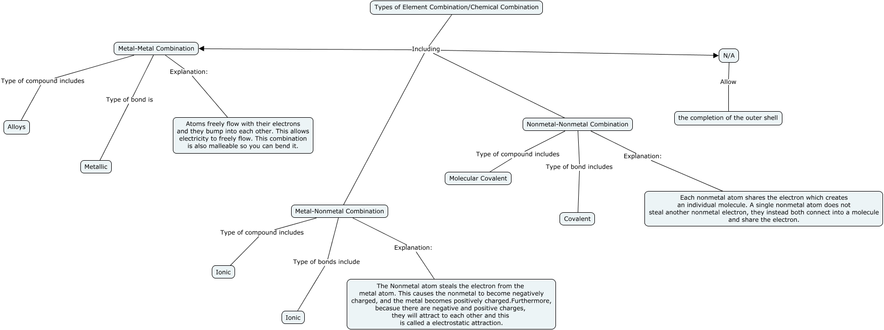 This Concept Map, created with IHMC CmapTools, has information related to: Types of combinations, Metal-Nonmetal Combination Type of bonds include Ionic, Nonmetal-Nonmetal Combination Type of bond includes Covalent, Types of Element Combination/Chemical Combination Including N/A, Types of Element Combination/Chemical Combination Including Metal-Nonmetal Combination, Metal-Nonmetal Combination Type of compound includes Ionic, Types of Element Combination/Chemical Combination Including Metal-Metal Combination, Metal-Metal Combination Type of compound includes Alloys, Metal-Nonmetal Combination Explanation: The Nonmetal atom steals the electron from the metal atom. This causes the nonmetal to become negatively charged, and the metal becomes positively charged.Furthermore, becasue there are negative and positive charges, they will attract to each other and this is called a electrostatic attraction., Types of Element Combination/Chemical Combination Including Nonmetal-Nonmetal Combination, Nonmetal-Nonmetal Combination Type of compound includes Molecular Covalent, Metal-Metal Combination Type of bond is Metallic, N/A Allow the completion of the outer shell, Nonmetal-Nonmetal Combination Explanation: Each nonmetal atom shares the electron which creates an individual molecule. A single nonmetal atom does not steal another nonmetal electron, they instead both connect into a molecule and share the electron., Metal-Metal Combination Explanation: Atoms freely flow with their electrons and they bump into each other. This allows electricity to freely flow. This combination is also malleable so you can bend it.
