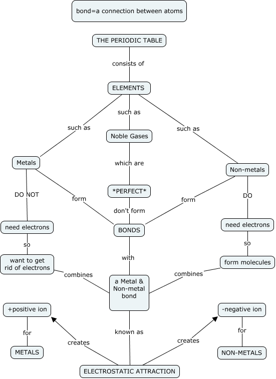 This Concept Map, created with IHMC CmapTools, has information related to: Periodic Table C-map, want to get rid of electrons combines a Metal & Non-metal bond, a Metal & Non-metal bond known as ELECTROSTATIC ATTRACTION, Metals form BONDS, Noble Gases which are *PERFECT*, THE PERIODIC TABLE consists of ELEMENTS, form molecules combines a Metal & Non-metal bond, Non-metals form BONDS, ELECTROSTATIC ATTRACTION creates -negative ion, +positive ion for METALS, ELECTROSTATIC ATTRACTION creates +positive ion, BONDS with a Metal & Non-metal bond, Metals DO NOT need electrons, need electrons so form molecules, need electrons so want to get rid of electrons, Non-metals DO need electrons, -negative ion for NON-METALS, ELEMENTS such as Non-metals, ELEMENTS such as Metals, *PERFECT* don't form BONDS, ELEMENTS such as Noble Gases