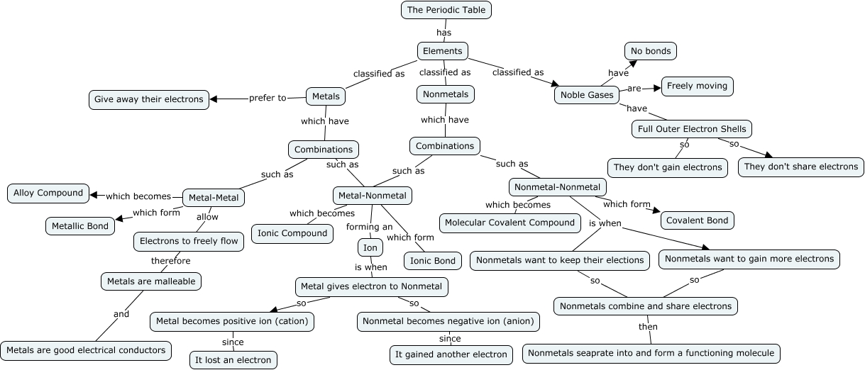 This Concept Map, created with IHMC CmapTools, has information related to: Chemical Bonding, Metal-Metal which becomes Alloy Compound, Metals are malleable and Metals are good electrical conductors, Elements classified as Nonmetals, Noble Gases are Freely moving, Metal-Nonmetal which becomes Ionic Compound, Metal-Nonmetal forming an Ion, Combinations such as Metal-Nonmetal, Combinations such as Nonmetal-Nonmetal, The Periodic Table has Elements, Full Outer Electron Shells so They don't share electrons, Metal gives electron to Nonmetal so Nonmetal becomes negative ion (anion), Noble Gases have No bonds, Nonmetals combine and share electrons then Nonmetals seaprate into and form a functioning molecule, Metals which have Combinations, Nonmetal-Nonmetal which form Covalent Bond, Combinations such as Metal-Nonmetal, Electrons to freely flow therefore Metals are malleable, Metal-Metal which form Metallic Bond, Metal-Nonmetal which form Ionic Bond, Nonmetals which have Combinations