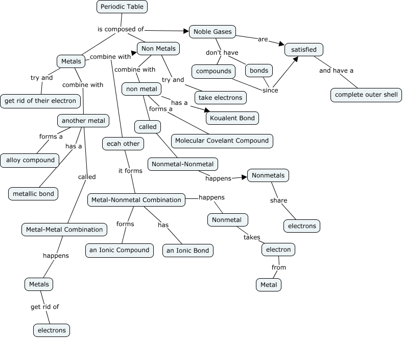 This Concept Map, created with IHMC CmapTools, has information related to: Chemical Bonding, another metal called Metal-Metal Combination, Periodic Table is composed of Non Metals, non metal has a Koualent Bond, Metals combine with another metal, non metal ???? Nonmetal-Nonmetal, another metal has a metallic bond, Periodic Table is composed of Noble Gases, non metal forms a Molecular Covelant Compound, Metals combine with ecah other, compounds since satisfied, electron from Metal, Noble Gases are satisfied, Noble Gases don't have bonds, Nonmetal takes electron, Nonmetals share electrons, Metals get rid of electrons, Non Metals combine with non metal, bonds since satisfied, ecah other it forms Metal-Nonmetal Combination, Nonmetal-Nonmetal happens Nonmetals