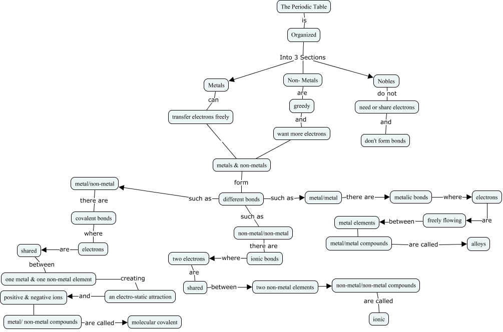 This Concept Map, created with IHMC CmapTools, has information related to: Periodic Table Chemical Bondings, different bonds such as non-metal/non-metal, covalent bonds where electrons, greedy and want more electrons, shared between one metal & one non-metal element, ionic bonds where two electrons, non-metal/non-metal compounds are called ionic, electrons are shared, non-metal/non-metal there are ionic bonds, two non-metal elements ???? non-metal/non-metal compounds, metalic bonds where electrons, Metals can transfer electrons freely, metal/metal there are metalic bonds, metals & non-metals form different bonds, freely flowing between metal elements, electrons are freely flowing, metal/metal compounds are called alloys, different bonds such as metal/non-metal, Organized Into 3 Sections Metals, two electrons are shared, transfer electrons freely metals & non-metals