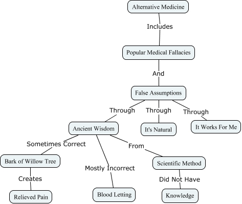 This Concept Map, created with IHMC CmapTools, has information related to: Alternative Medicine, Ancient Wisdom Sometimes Correct Bark of Willow Tree, False Assumptions Through It Works For Me, Scientific Method Did Not Have Knowledge, False Assumptions Through It's Natural, Ancient Wisdom From Scientific Method, Bark of Willow Tree Creates Relieved Pain, Alternative Medicine Includes Popular Medical Fallacies, Popular Medical Fallacies And False Assumptions, False Assumptions Through Ancient Wisdom, Ancient Wisdom Mostly Incorrect Blood Letting