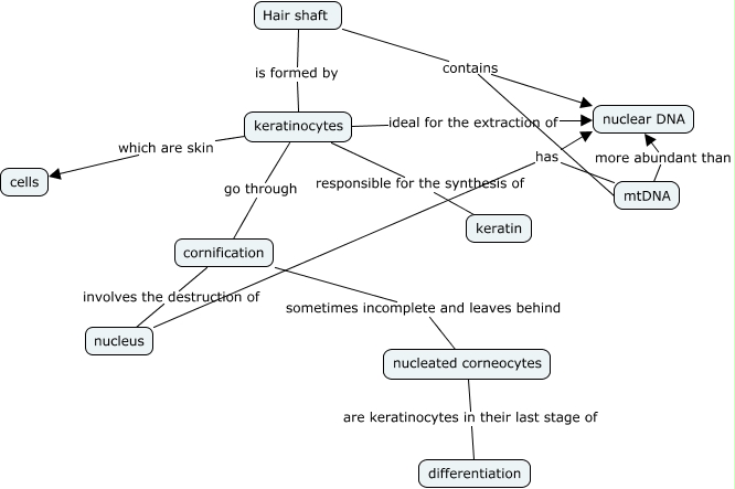 This Concept Map, created with IHMC CmapTools, has information related to: Hair Shaft and DNA, keratinocytes which are skin cells, cornification sometimes incomplete and leaves behind nucleated corneocytes, nucleus has mtDNA, keratinocytes ideal for the extraction of nuclear DNA, nucleated corneocytes are keratinocytes in their last stage of differentiation, keratinocytes responsible for the synthesis of keratin, Hair shaft is formed by keratinocytes, cornification involves the destruction of nucleus, nucleus has nuclear DNA, keratinocytes go through cornification, mtDNA more abundant than nuclear DNA, Hair shaft contains nuclear DNA, Hair shaft contains mtDNA