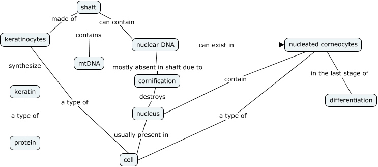This Concept Map, created with IHMC CmapTools, has information related to: DNA in Hair, nuclear DNA can exist in nucleated corneocytes, keratin a type of protein, nuclear DNA mostly absent in shaft due to cornification, cornification destroys nucleus, keratinocytes synthesize keratin, shaft can contain nuclear DNA, shaft contains mtDNA, nucleated corneocytes a type of cell, nucleus usually present in cell, nucleated corneocytes contain nucleus, nucleated corneocytes in the last stage of differentiation, shaft made of keratinocytes, keratinocytes a type of cell