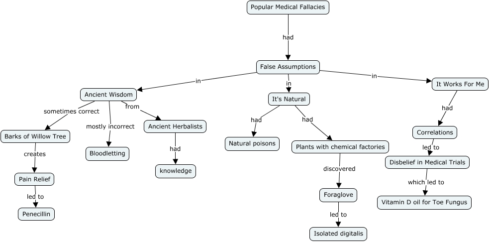 This Concept Map, created with IHMC CmapTools, has information related to: Popular Medical Fallacies, Pain Relief led to Penecillin, Disbelief in Medical Trials which led to Vitamin D oil for Toe Fungus, Ancient Herbalists had knowledge, False Assumptions in It Works For Me, Plants with chemical factories discovered Foraglove, Barks of Willow Tree creates Pain Relief, Popular Medical Fallacies had False Assumptions, It's Natural had Plants with chemical factories, False Assumptions in It's Natural, Correlations led to Disbelief in Medical Trials, Foraglove led to Isolated digitalis, Ancient Wisdom mostly incorrect Bloodletting, It Works For Me had Correlations, Ancient Wisdom sometimes correct Barks of Willow Tree, It's Natural had Natural poisons, Ancient Wisdom from Ancient Herbalists, False Assumptions in Ancient Wisdom