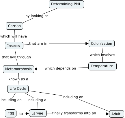 This Concept Map, created with IHMC CmapTools, has information related to: ENTOMOLGY, Carrion which will have Insects, Egg to Larvae, Metamorphosis known as a Life Cycle, Colonization which involves Temperature, Determining PMI by looking at Carrion, Insects that live through Metamorphosis, Life Cycle including a Larvae, Life Cycle including an Adult, Insects that are in Colonization, Life Cycle including an Egg, Temperature which depends on Metamorphosis, Larvae finally transforms into an Adult