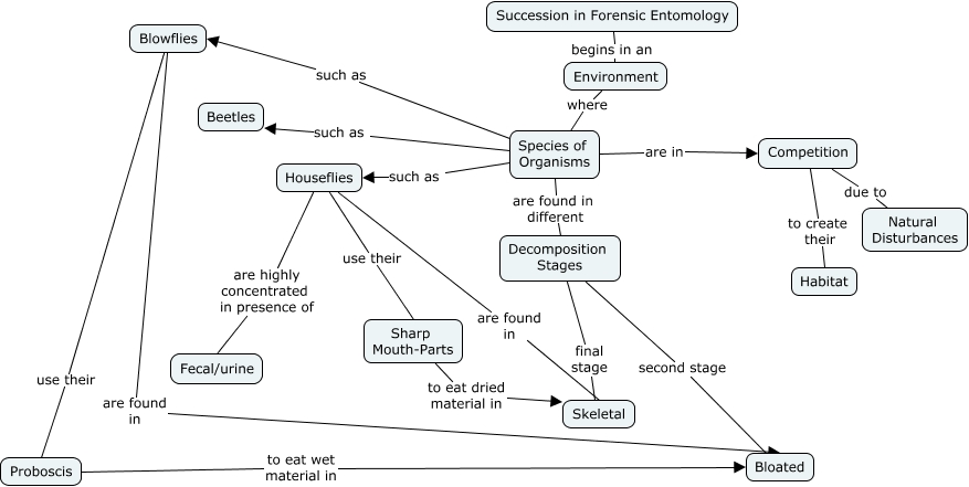 This Concept Map, created with IHMC CmapTools, has information related to: Succession, Blowflies use their Proboscis, Species of Organisms such as Houseflies, Houseflies are highly concentrated in presence of Fecal/urine, Species of Organisms such as Blowflies, Blowflies are found in Bloated, Competition to create their Habitat, Houseflies are found in Skeletal, Environment where Species of Organisms, Houseflies use their Sharp Mouth-Parts, Decomposition Stages final stage Skeletal, Species of Organisms are found in different Decomposition Stages, Competition due to Natural Disturbances, Proboscis to eat wet material in Bloated, Succession in Forensic Entomology begins in an Environment, Sharp Mouth-Parts to eat dried material in Skeletal, Decomposition Stages second stage Bloated, Species of Organisms such as Beetles, Species of Organisms are in Competition