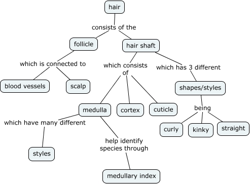 This Concept Map, created with IHMC CmapTools, has information related to: Hair Structure, hair consists of the hair shaft, medulla help identify species through medullary index, hair shaft which consists of medulla, follicle which is connected to blood vessels, shapes/styles being straight, hair consists of the follicle, hair shaft which has 3 different shapes/styles, medulla which have many different styles, hair shaft which consists of cuticle, hair shaft which consists of cortex, shapes/styles being curly, shapes/styles being kinky, follicle which is connected to scalp