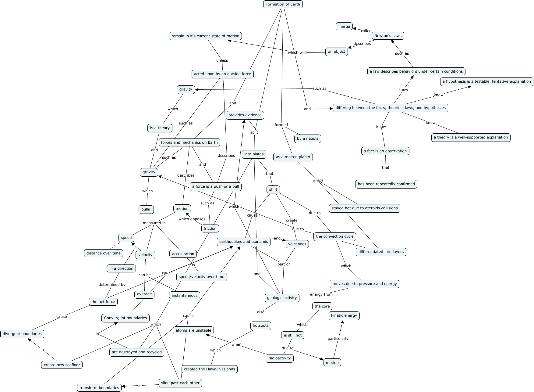 This Concept Map, created with IHMC CmapTools, has information related to: p.4 Kesler Extra Credit, transform boundaries cause earthquakes and tsunamis, acceleration is speed/velocity over time, earthquakes and tsunamis and volcanoes, velocity can be instantaneous, Convergent boundaries cause earthquakes and tsunamis, are destroyed and recycled in Convergent boundaries, radioactivity when atoms are unstable, the convection cycle which moves due to pressure and energy, velocity is speed, is a theory and gravity, Newton's Laws describes an object, motion measured in speed, Newton's Laws called inertia, differing between the facts, theories, laws, and hypothesies know a fact is an observation, Formation of Earth formed by a nebula, acted upon by an outside force such as gravity, moves due to pressure and energy energy from the core, Formation of Earth split into plates, gravity which pulls, a fact is an observation that has been repeatedly confirmed