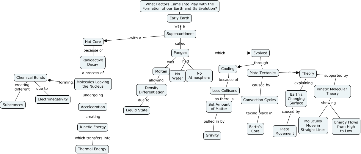 This Concept Map, created with IHMC CmapTools, has information related to: Early Earth and Its Evolution - 1st Semester EC, Pangea was Molten, Pangea had No Atmosphere, Pangea had No Water, Kinetic Molecular Theory showing Molucules Move in Straight Lines, Evolved through Plate Tectonics, Molecules Leaving the Nucleus undergoing Accelearation, Evolved through Cooling, Pangea which Evolved, Chemical Bonds due to Electronegativity, Plate Tectonics caused by Convection Cycles, Hot Core because of Radioactive Decay, Early Earth was a Supercontinent, Accelearation creating Kinetic Energy, Kinetic Energy which transfers into Thermal Energy, Theory explaining Earth's Changing Surface, Set Amount of Matter pulled in by Gravity, Less Collisons as there is Set Amount of Matter, Molten allowing Density Differentiation, Supercontinent called Pangea, What Factors Came Into Play with the Formation of our Earth and Its Evolution? ???? Early Earth