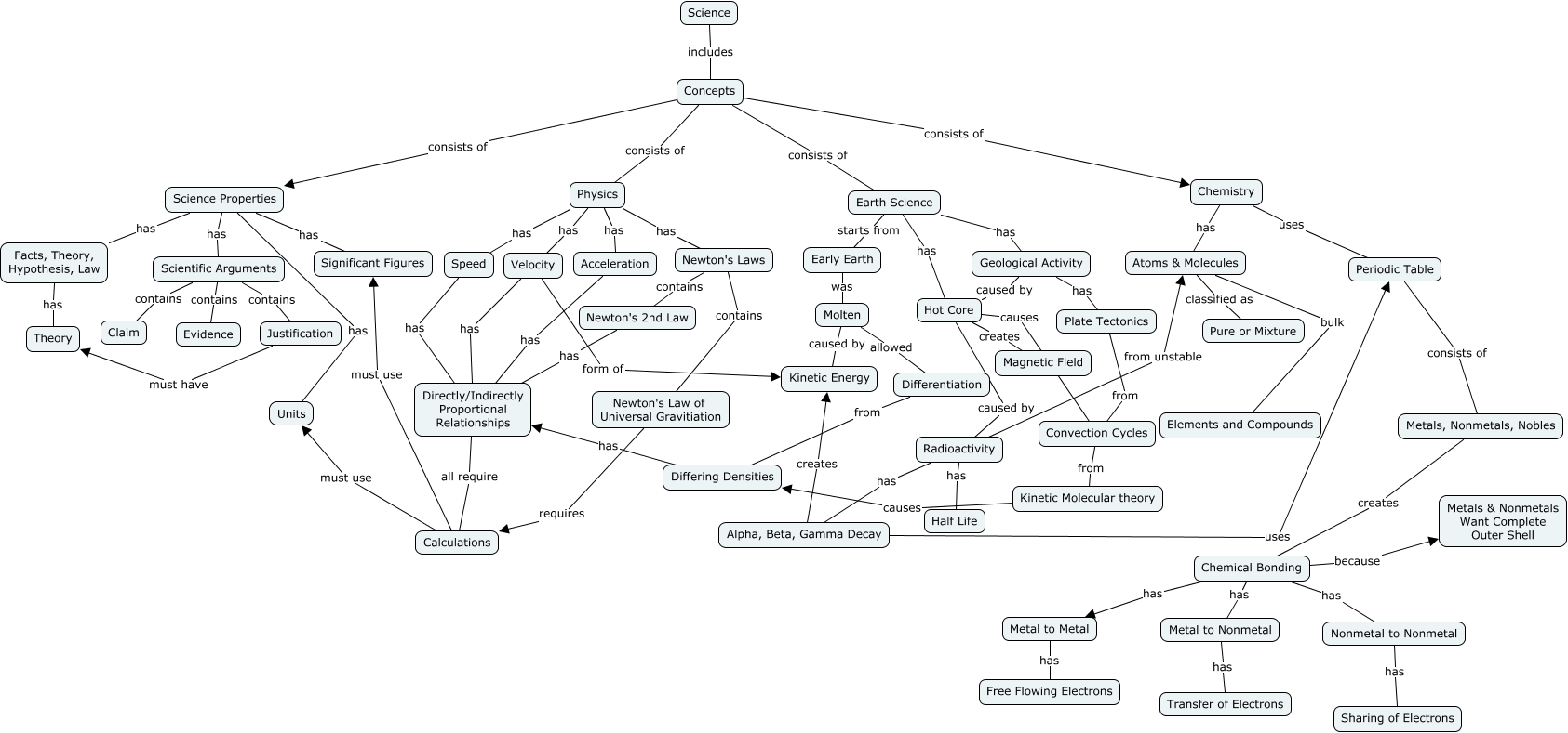 This Concept Map, created with IHMC CmapTools, has information related to: Science Connections, Molten caused by Kinetic Energy, Kinetic Molecular theory causes Differing Densities, Chemical Bonding because Metals & Nonmetals Want Complete Outer Shell, Science Properties has Facts, Theory, Hypothesis, Law, Chemical Bonding has Nonmetal to Nonmetal, Newton's Laws contains Newton's Law of Universal Gravitiation, Periodic Table consists of Metals, Nonmetals, Nobles, Chemical Bonding has Metal to Nonmetal, Physics has Acceleration, Convection Cycles from Kinetic Molecular theory, Scientific Arguments contains Justification, Geological Activity caused by Hot Core, Science Properties has Scientific Arguments, Alpha, Beta, Gamma Decay uses Periodic Table, Chemistry has Atoms & Molecules, Atoms & Molecules bulk Elements and Compounds, Calculations must use Significant Figures, Early Earth was Molten, Concepts consists of Science Properties, Hot Core caused by Radioactivity