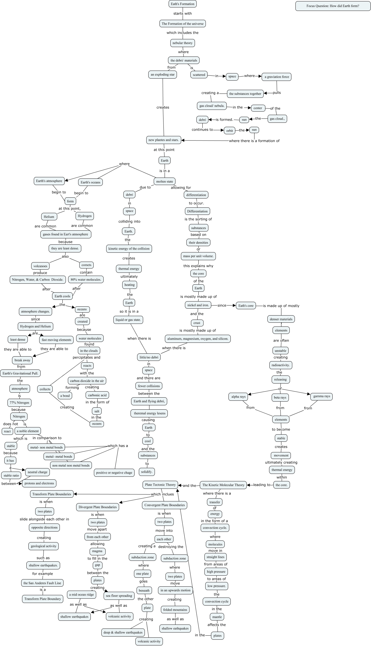 This Concept Map, created with IHMC CmapTools, has information related to: Extra Credit- Earth's Formation, shallow earthquakes. for example the San Anderes Fault Line, carbonic acid in the form of salt, fewer collisions between the Earth and flying debri,, Plate Tectonic Theory which inclues Convergent Plate Boundaries, Transform Plate Boundaries is when two plates, The Kinetic Molecular Theory and the Plate Tectonic Theory, break away from Earth's Gravitational Pull., Differentiation is the sorting of substances, reacts with the carbon dioxide in the air, releasing of alpha rays, an exploding star creates new plantes and stars., a mid ocean ridge as well as shallow earthquakes, plates creating sea floor spreading, comets contain 80% water molecules., The Kinetic Molecular Theory where there is a transfer, non metal non metal bonds which has a positive or negative chage, geological activity such as shallow earthquakes., one plate goes beneath, transfer of energy, nickel and iron. since Eath's core