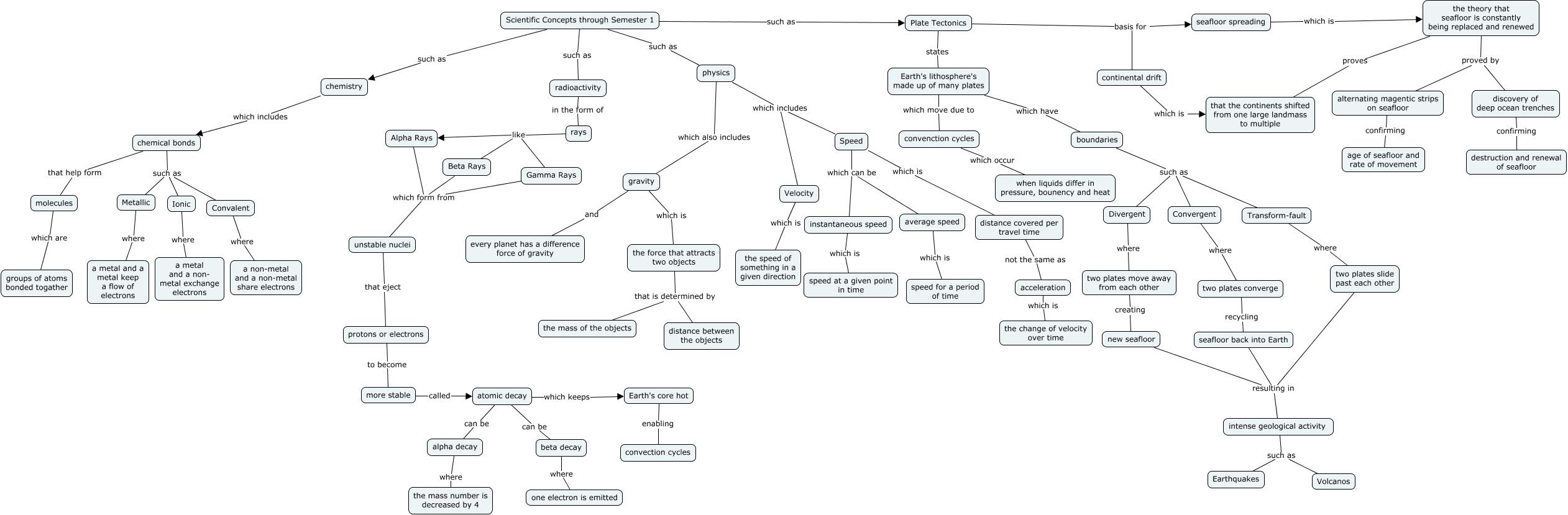 This Concept Map, created with IHMC CmapTools, has information related to: Final CMap, Scientific Concepts through Semester 1 such as physics, convenction cycles which occur when liquids differ in pressure, bounency and heat, Ionic where a metal and a non- metal exchange electrons, seafloor back into Earth resulting in intense geological activity, chemical bonds such as Metallic, alpha decay where the mass number is decreased by 4, Earth's lithosphere's made up of many plates which move due to convenction cycles, atomic decay which keeps Earth's core hot, Earth's core hot enabling convection cycles, distance covered per travel time not the same as acceleration, Convalent such as Metallic, rays like Beta Rays, intense geological activity such as Earthquakes, continental drift which is that the continents shifted from one large landmass to multiple, Divergent such as Convergent, boundaries such as Convergent, rays like Gamma Rays, gravity and every planet has a difference force of gravity, Speed which can be average speed, two plates slide past each other resulting in intense geological activity