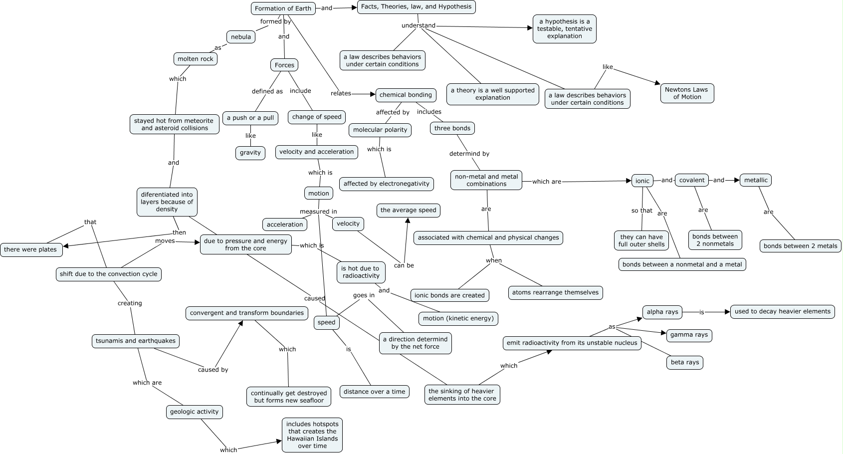 This Concept Map, created with IHMC CmapTools, has information related to: Extra Credit- Stephanie Chen, motion measured in acceleration, Formation of Earth and Facts, Theories, law, and Hypothesis, Formation of Earth and Forces, chemical bonding affected by molecular polarity, molten rock which stayed hot from meteorite and asteroid collisions, Formation of Earth relates chemical bonding, alpha rays is used to decay heavier elements, Forces include change of speed, emit radioactivity from its unstable nucleus as alpha rays, covalent and metallic, shift due to the convection cycle moves due to pressure and energy from the core, nebula as molten rock, Facts, Theories, law, and Hypothesis understand a law describes behaviors under certain conditions, there were plates that shift due to the convection cycle, diferentiated into layers because of density caused the sinking of heavier elements into the core, geologic activity which includes hotspots that creates the Hawaiian Islands over time, due to pressure and energy from the core which is is hot due to radioactivity, three bonds determind by non-metal and metal combinations, convergent and transform boundaries which continually get destroyed but forms new seafloor, Facts, Theories, law, and Hypothesis understand a theory is a well supported explanation