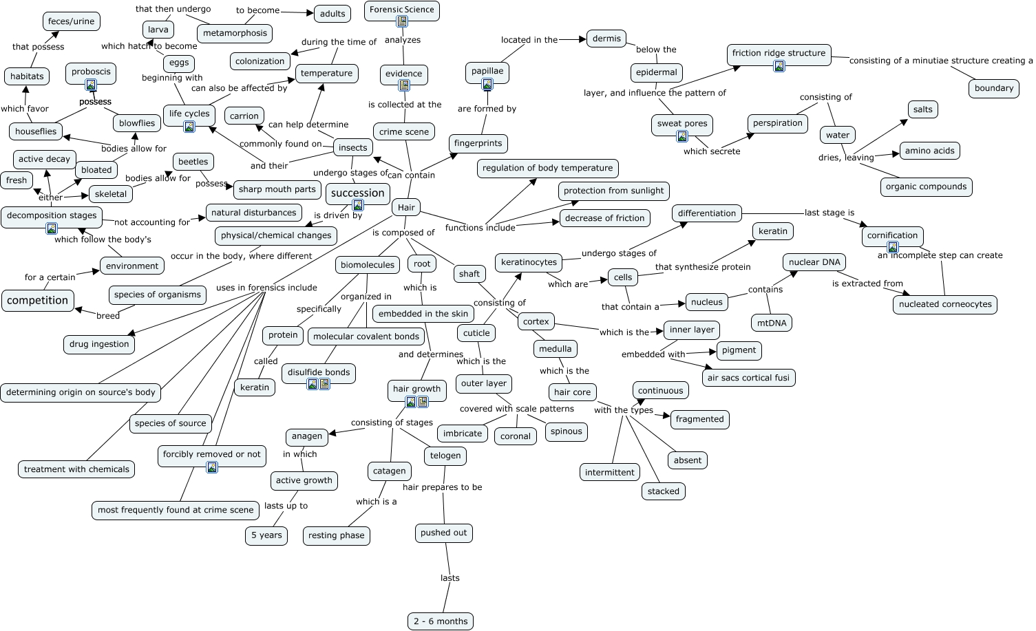 This Concept Map, created with IHMC CmapTools, has information related to: Extra Credit, Hair functions include regulation of body temperature, water dries, leaving amino acids, insects undergo stages of succession, decomposition stages either fresh, sweat pores which secrete perspiration, medulla which is the hair core, biomolecules organized in disulfide bonds, crime scene can contain Hair, nucleus contains nuclear DNA, environment which follow the body's decomposition stages, hair core with the types continuous, outer layer covered with scale patterns imbricate, Hair is composed of root, hair growth consisting of stages telogen, papillae located in the dermis, telogen hair prepares to be pushed out, inner layer embedded with air sacs cortical fusi, metamorphosis to become adults, eggs which hatch to become larva, skeletal bodies allow for beetles