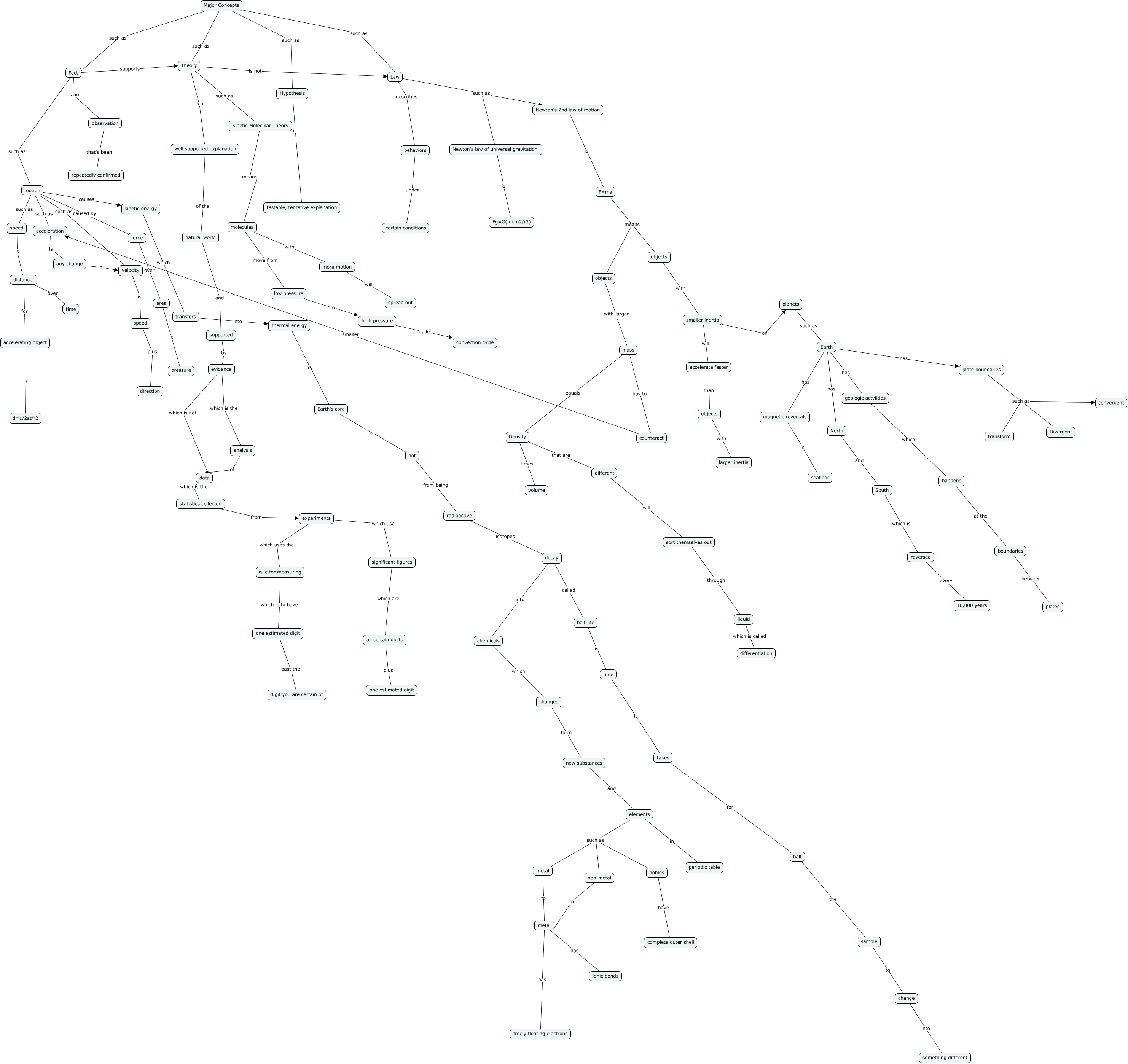 This Concept Map, created with IHMC CmapTools, has information related to: Major Concepts, different will sort themselves out, plate boundaries such as convergent, South which is reversed, experiments which uses the rule for measuring, natural world and supported, F=ma means objects, Earth has North, motion caused by force, molecules move from low pressure, objects with larger inertia, Major Concepts such as Hypothesis, geologic actviities which happens, velocity is speed, radioactive isotopes decay, Earth has geologic actviities, Newton’s law of universal gravitation is Fg=G(mem2/r2), new substances and elements, objects with smaller inertia, supported by evidence, accelerate faster than objects