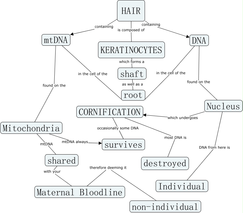 This Concept Map, created with IHMC CmapTools, has information related to: Hair Process cMap, mtDNA in the cell of the root, HAIR is composed of KERATINOCYTES, Nucleus which undergoes CORNIFICATION, DNA found on the Nucleus, KERATINOCYTES which forms a shaft, shaft as well as a root, shared with your Maternal Bloodline, mtDNA found on the Mitochondria, DNA in the cell of the root, Mitochondria mtDNA shared, CORNIFICATION most DNA is destroyed, HAIR containing DNA, CORNIFICATION occasionally some DNA survives, Mitochondria mtDNA always survives, Maternal Bloodline therefore deeming it non-individual, HAIR containing mtDNA, Nucleus DNA from here is Individual
