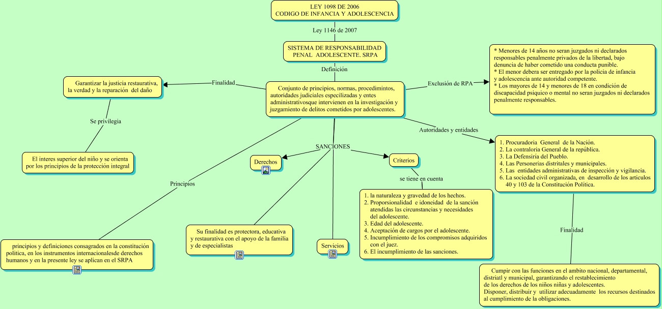 Este Cmap, tiene información relacionada con: sistema de responsabilidad penal adolescente, Conjunto de principios, normas, procedimintos, autoridades judiciales especilizadas y entes administrativosque intervienen en la investigación y juzgamiento de delitos cometidos por adolescentes. Finalidad Garantizar la justicia restaurativa, la verdad y la reparación del daño, Conjunto de principios, normas, procedimintos, autoridades judiciales especilizadas y entes administrativosque intervienen en la investigación y juzgamiento de delitos cometidos por adolescentes. SANCIONES Criterios, 1. Procuradoria General de la Nación. 2. La contraloria General de la república. 3. La Defensiría del Pueblo. 4. Las Personerias distritales y municipales. 5. Las entidades administrativas de inspección y vigilancia. 6. La sociedad civil organizada, en desarrollo de los articulos 40 y 103 de la Constitución Política. Finalidad Cumpir con las funciones en el ambito nacional, departamental, distriatl y municipal, garantizando el restablecimiento de los derechos de los niños niñas y adolescentes. Disponer, distribuir y utilizar adecuadamente los recursos destinados al cumplimiento de la obligaciones., Conjunto de principios, normas, procedimintos, autoridades judiciales especilizadas y entes administrativosque intervienen en la investigación y juzgamiento de delitos cometidos por adolescentes. SANCIONES Derechos, Conjunto de principios, normas, procedimintos, autoridades judiciales especilizadas y entes administrativosque intervienen en la investigación y juzgamiento de delitos cometidos por adolescentes. SANCIONES Su finalidad es protectora, educativa y restaurativa con el apoyo de la familia y de especialistas, Conjunto de principios, normas, procedimintos, autoridades judiciales especilizadas y entes administrativosque intervienen en la investigación y juzgamiento de delitos cometidos por adolescentes. SANCIONES Derechos, Conjunto de principios, normas, procedimintos, autoridades judiciales especilizadas y entes administrativosque intervienen en la investigación y juzgamiento de delitos cometidos por adolescentes. SANCIONES Servicios, SISTEMA DE RESPONSABILIDAD PENAL ADOLESCENTE. SRPA Definición Conjunto de principios, normas, procedimintos, autoridades judiciales especilizadas y entes administrativosque intervienen en la investigación y juzgamiento de delitos cometidos por adolescentes., Garantizar la justicia restaurativa, la verdad y la reparación del daño Se privilegia El interes superior del niño y se orienta por los principios de la protección integral, Conjunto de principios, normas, procedimintos, autoridades judiciales especilizadas y entes administrativosque intervienen en la investigación y juzgamiento de delitos cometidos por adolescentes. Autoridades y entidades 1. Procuradoria General de la Nación. 2. La contraloria General de la república. 3. La Defensiría del Pueblo. 4. Las Personerias distritales y municipales. 5. Las entidades administrativas de inspección y vigilancia. 6. La sociedad civil organizada, en desarrollo de los articulos 40 y 103 de la Constitución Política., Conjunto de principios, normas, procedimintos, autoridades judiciales especilizadas y entes administrativosque intervienen en la investigación y juzgamiento de delitos cometidos por adolescentes. SANCIONES Servicios, Conjunto de principios, normas, procedimintos, autoridades judiciales especilizadas y entes administrativosque intervienen en la investigación y juzgamiento de delitos cometidos por adolescentes. Principios principios y definiciones consagrados en la constitución politica, en los instrumentos internacionalesde derechos humanos y en la presente ley se aplican en el SRPA, Conjunto de principios, normas, procedimintos, autoridades judiciales especilizadas y entes administrativosque intervienen en la investigación y juzgamiento de delitos cometidos por adolescentes. Exclusión de RPA * Menores de 14 años no seran juzgados ni declarados responsables penalmente privados de la libertad, bajo denuncia de haber cometido una conducta punible. * El menor debera ser entregado por la policia de infancia y adolescencia ante autoridad competente. * Los mayores de 14 y menores de 18 en condición de discapacidad psiquico o mental no seran juzgados ni declarados penalmente responsables., Conjunto de principios, normas, procedimintos, autoridades judiciales especilizadas y entes administrativosque intervienen en la investigación y juzgamiento de delitos cometidos por adolescentes. SANCIONES Su finalidad es protectora, educativa y restaurativa con el apoyo de la familia y de especialistas, LEY 1098 DE 2006 CODIGO DE INFANCIA Y ADOLESCENCIA Ley 1146 de 2007 SISTEMA DE RESPONSABILIDAD PENAL ADOLESCENTE. SRPA, Criterios se tiene en cuenta 1. la naturaleza y gravedad de los hechos. 2. Proporsionalidad e idoneidad de la sanción atendidas las circunstancias y necesidades del adolescente. 3. Edad del adolescente. 4. Aceptación de cargos por el adolescente. 5. Incumplimiento de los compromisos adquiridos con el juez. 6. El incumplimiento de las sanciones., Conjunto de principios, normas, procedimintos, autoridades judiciales especilizadas y entes administrativosque intervienen en la investigación y juzgamiento de delitos cometidos por adolescentes. SANCIONES Criterios