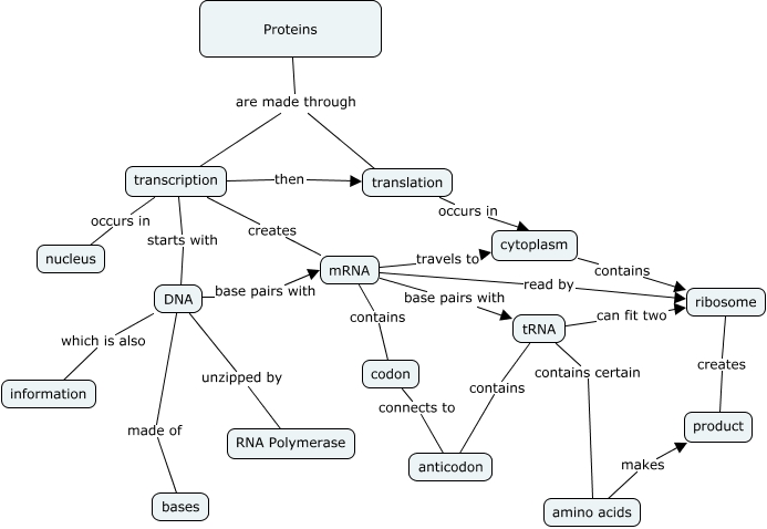 This Concept Map, created with IHMC CmapTools, has information related to: protein synthesis, mRNA travels to cytoplasm, transcription occurs in nucleus, tRNA contains certain amino acids, DNA base pairs with mRNA, ribosome creates product, Proteins are made through translation, tRNA contains anticodon, amino acids makes product, mRNA contains codon, transcription starts with DNA, tRNA can fit two ribosome, DNA made of bases, Proteins are made through transcription, translation occurs in cytoplasm, DNA unzipped by RNA Polymerase, transcription creates mRNA, codon connects to anticodon, transcription then translation, mRNA base pairs with tRNA, DNA which is also information
