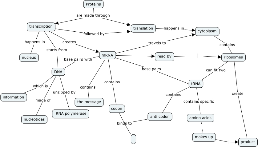 This Concept Map, created with IHMC CmapTools, has information related to: Protein Synthesis, amino acids makes up, tRNA contains specific amino acids, transcription happens in nucleus, mRNA base pairs with DNA, mRNA contains the message, transcription starts from DNA, codon binds to, DNA made of nucleotides, mRNA base pairs tRNA, mRNA read by, ribosomes can fit two tRNA, read by ribosomes, mRNA contains codon, DNA which is information, anti codon binds to, transcription followed by translation, makes up product, mRNA travels to cytoplasm, cytoplasm contains ribosomes, ribosomes create product