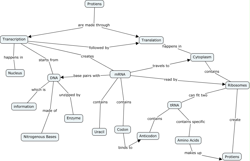 This Concept Map, created with IHMC CmapTools, has information related to: Protien Synthesis, Ribosomes create Protiens, DNA made of Nitrogenous Bases, Amino Acids makes up Protiens, Ribosomes can fit two tRNA, Transcription starts from DNA, DNA which is information, mRNA read by Ribosomes, mRNA base pairs with DNA, Cytoplasm contains Ribosomes, mRNA travels to Cytoplasm, tRNA contains Anticodon, Transcription happens in Nucleus, mRNA contains Uracil, DNA unzipped by Enzyme, Codon binds to Anticodon, Transcription followed by Translation, Translation happens in Cytoplasm, mRNA contains Codon, Transcription creates mRNA, Protiens are made through Transcription