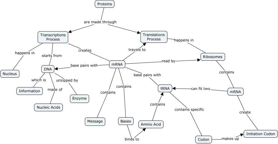 This Concept Map, created with IHMC CmapTools, has information related to: Protein Synthesis, mRNA base pairs with tRNA, DNA made of Nucleic Acids, mRNA read by Ribosomes, Proteins are made through Transcriptions Process, Amino Acid contains tRNA, Bases binds to Amino Acid, Ribosomes contains mRNA, mRNA base pairs with DNA, mRNA create Initiation Codon, DNA which is Information, mRNA contains Bases, Translations Process happens in Ribosomes, mRNA can fit two tRNA, Proteins are made through Translations Process, Transcriptions Process starts from DNA, mRNA contains Message, Transcriptions Process happens in Nucleus, tRNA contains specific Codon, DNA unzipped by Enzyme, mRNA travels to Translations Process