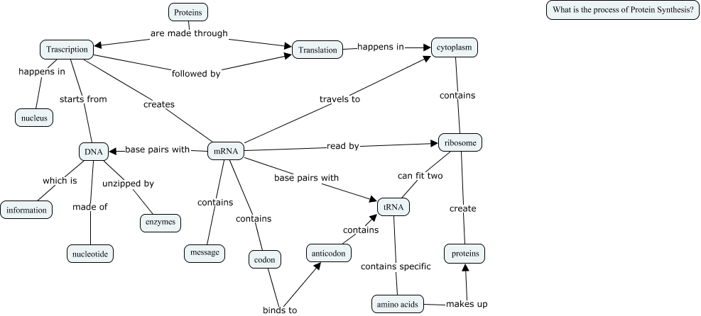 This Concept Map, created with IHMC CmapTools, has information related to: Protein Synthesis, Translation happens in cytoplasm, DNA unzipped by enzymes, ribosome can fit two tRNA, codon binds to anticodon, mRNA base pairs with DNA, Trascription followed by Translation, DNA made of nucleotide, cytoplasm contains ribosome, Proteins are made through Trascription, mRNA contains message, Proteins are made through Translation, mRNA contains codon, amino acids makes up proteins, mRNA read by ribosome, DNA which is information, Trascription starts from DNA, ribosome create proteins, tRNA contains specific amino acids, Trascription creates mRNA, Trascription happens in nucleus