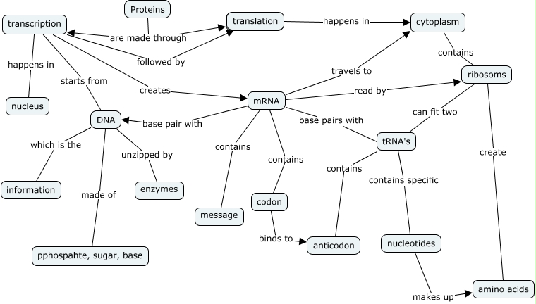 This Concept Map, created with IHMC CmapTools, has information related to: Protein synthesis, mRNA base pair with DNA, DNA which is the information, nucleotides makes up amino acids, DNA made of pphospahte, sugar, base, translation happens in cytoplasm, tRNA's contains anticodon, cytoplasm contains ribosoms, tRNA's contains specific nucleotides, Proteins are made through transcription, Proteins are made through translation, transcription starts from DNA, transcription creates mRNA, ribosoms create amino acids, mRNA contains message, transcription happens in nucleus, ribosoms can fit two tRNA's, transcription followed by translation, DNA unzipped by enzymes, mRNA contains codon, codon binds to anticodon