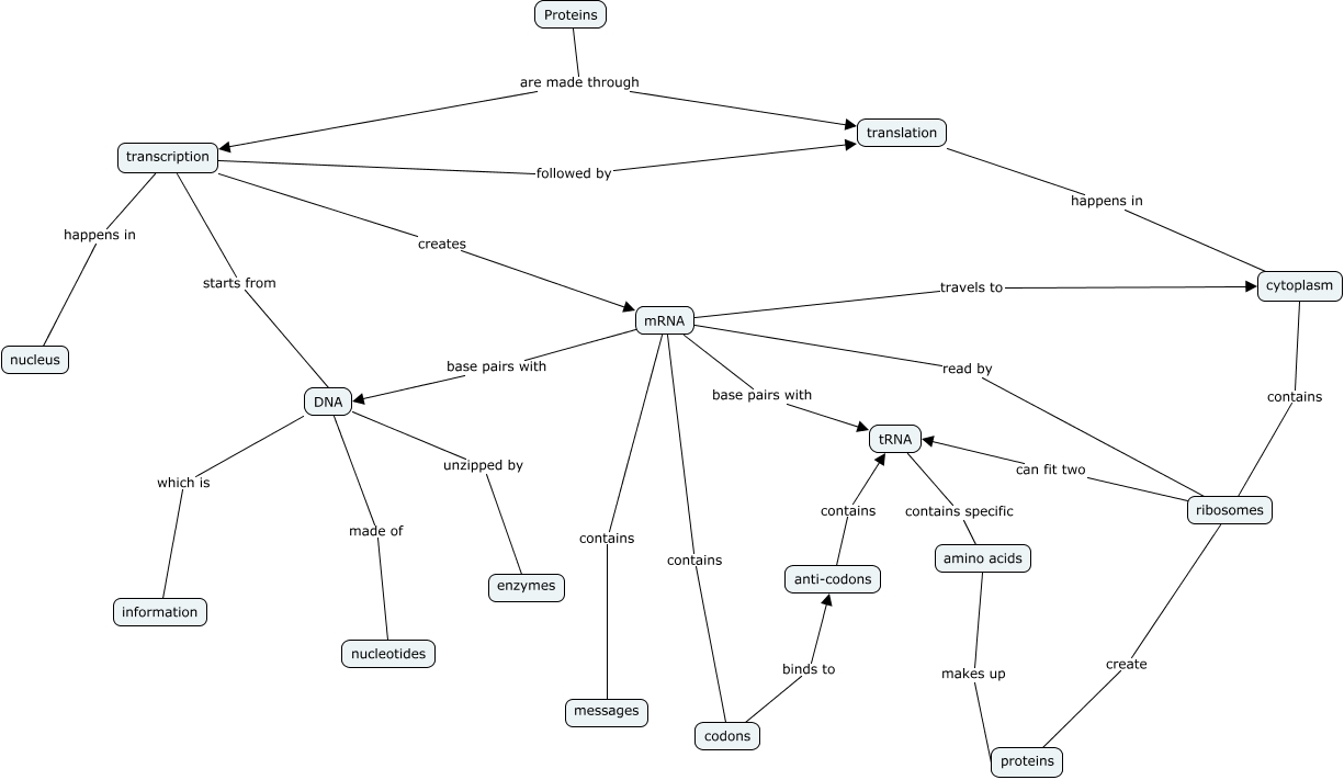This Concept Map, created with IHMC CmapTools, has information related to: Protein Synthesis, mRNA base pairs with tRNA, transcription followed by translation, DNA unzipped by enzymes, Proteins are made through transcription, transcription happens in nucleus, mRNA read by ribosomes, amino acids makes up proteins, ribosomes can fit two tRNA, DNA which is information, mRNA base pairs with DNA, anti-codons contains tRNA, mRNA contains messages, codons binds to anti-codons, cytoplasm contains ribosomes, ribosomes create proteins, DNA made of nucleotides, mRNA travels to cytoplasm, mRNA contains codons, tRNA contains specific amino acids, translation happens in cytoplasm