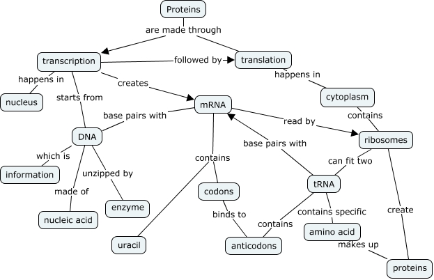 This Concept Map, created with IHMC CmapTools, has information related to: Protein Synthesis, DNA which is information, mRNA contains uracil, DNA unzipped by enzyme, transcription followed by translation, Proteins are made through translation, cytoplasm contains ribosomes, tRNA base pairs with mRNA, transcription starts from DNA, ribosomes create proteins, ribosomes can fit two tRNA, mRNA contains codons, transcription creates mRNA, translation happens in cytoplasm, tRNA contains anticodons, mRNA base pairs with DNA, codons binds to anticodons, mRNA read by ribosomes, tRNA contains specific amino acid, DNA made of nucleic acid, transcription happens in nucleus