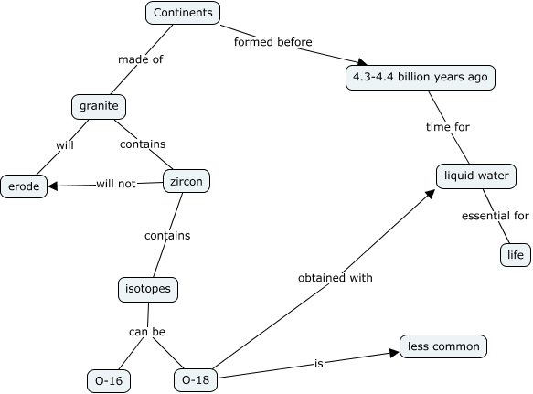 This Concept Map, created with IHMC CmapTools, has information related to: Precosious Earth Concept Map, granite will erode, Continents made of granite, isotopes can be O-18, zircon will not erode, liquid water essential for life, O-18 obtained with liquid water, O-18 is less common, zircon contains isotopes, isotopes can be O-16, 4.3-4.4 billion years ago time for liquid water, Continents formed before 4.3-4.4 billion years ago, granite contains zircon