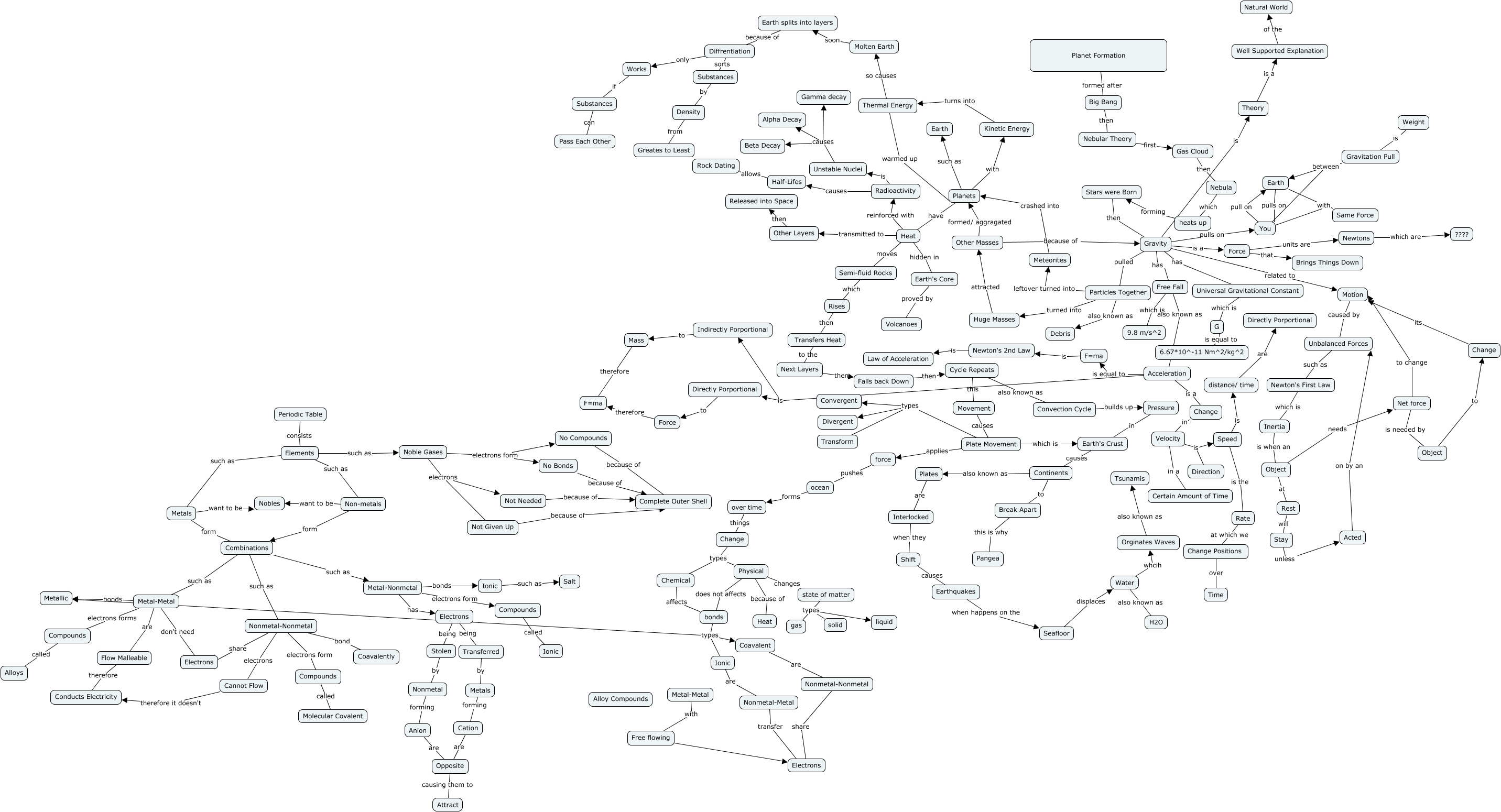 This Concept Map, created with IHMC CmapTools, has information related to: Unit 1 Extra Credit Concept Map, Orginates Waves also known as Tsunamis, F=ma is Newton's 2nd Law, Not Needed because of Complete Outer Shell, Gravity is Theory, Force that Brings Things Down, G is equal to 6.67*10^-11 Nm^2/kg^2, Planet Formation formed after Big Bang, Gravity is a Force, Change types Chemical, Ionic such as Salt, Stars were Born then Gravity, Unstable Nuclei causes Alpha Decay, Cation are Opposite, Gravity has Free Fall, Particles Together also known as Debris, Heat reinforced with Radioactivity, Huge Masses attracted Other Masses, Free flowing ???? Electrons, Combinations such as Nonmetal-Nonmetal, ocean forms over time
