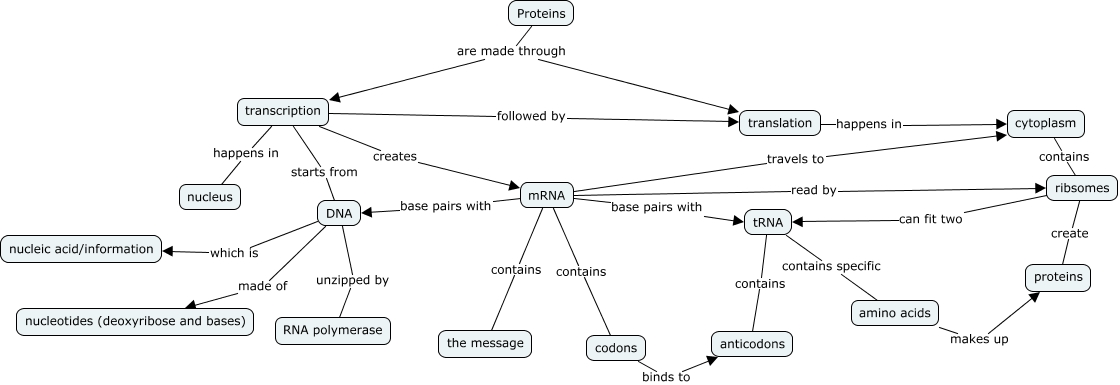 This Concept Map, created with IHMC CmapTools, has information related to: Protein Synthesis, Proteins are made through transcription, mRNA contains the message, mRNA base pairs with DNA, transcription starts from DNA, mRNA contains codons, amino acids makes up proteins, ribsomes can fit two tRNA, mRNA read by ribsomes, ribsomes create proteins, Proteins are made through translation, DNA which is nucleic acid/information, DNA made of nucleotides (deoxyribose and bases), transcription followed by translation, cytoplasm contains ribsomes, tRNA contains specific amino acids, tRNA contains anticodons, codons binds to anticodons, mRNA base pairs with tRNA, transcription happens in nucleus, mRNA travels to cytoplasm