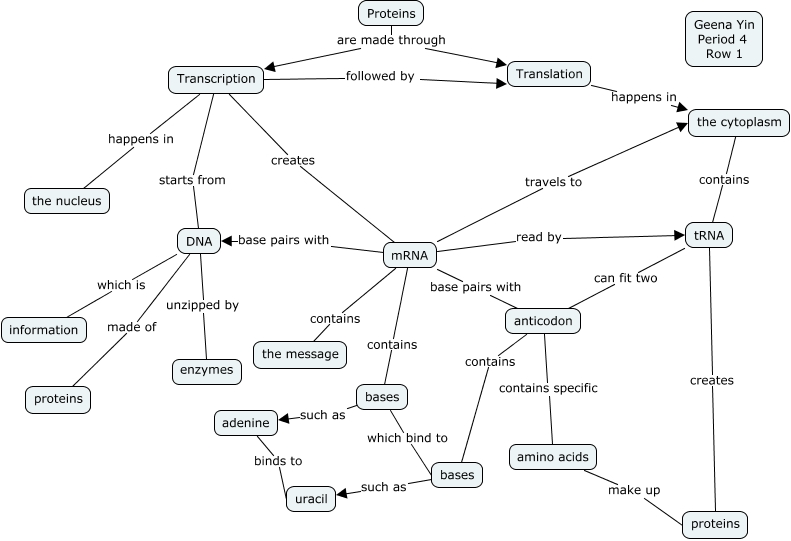 This Concept Map, created with IHMC CmapTools, has information related to: Protein Synthesis, Transcription followed by Translation, anticodon contains bases, Transcription creates mRNA, mRNA travels to the cytoplasm, bases which bind to bases, tRNA creates proteins, DNA unzipped by enzymes, Translation happens in the cytoplasm, DNA made of proteins, DNA which is information, bases such as uracil, anticodon contains specific amino acids, mRNA base pairs with DNA, mRNA base pairs with anticodon, mRNA contains the message, bases such as adenine, Proteins are made through Translation, Transcription happens in the nucleus, amino acids make up proteins, mRNA contains bases