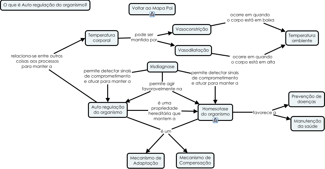 Esse mapa conceitual, produzido no IHMC CmapTools, tem a informação relacionada a: O que é Auto regulação, Vasodilatação ocorre em quando o corpo está em alta Temperatura ambiente, Irisdiagnose permite agir favoravelmente na Auto regulação do organismo, Irisdiagnose permite agir favoravelmente na Homesotase do organismo, Irisdiagnose permite detectar sinais de comprometimento e atuar para manter a Homesotase do organismo, Auto regulação do organismo é uma propriedade hereditária que mantem a Homesotase do organismo, Auto regulação do organismo é um Mecanismo de Adaptação, Irisdiagnose permite detectar sinais de comprometimento e atuar para manter a Auto regulação do organismo, Auto regulação do organismo relaciona-se entre outros coisas aos processos para manter a Temperatura corporal, Homesotase do organismo favorece a Manutenção da saúde, Vasoconstrição ocorre em quando o corpo está em baixa Temperatura ambiente, Temperatura corporal pode ser mantida por Vasoconstrição, Homesotase do organismo é um Mecanismo de Adaptação, Homesotase do organismo é um Mecanismo de Compensação, Auto regulação do organismo é um Mecanismo de Compensação, Homesotase do organismo favorece a Prevenção de doenças, Temperatura corporal pode ser mantida por Vasodilatação
