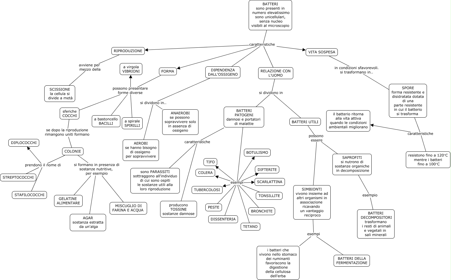 Questa Cmap, creata con IHMC CmapTools, contiene informazioni relative a: mappa batteri, BATTERI UTILI possono essere SIMBIONTI vivono insieme ad altri organismi in associazione ricavando un vantaggio reciproco, RELAZIONE CON L'UOMO si dividono in BATTERI UTILI, DIPENDENZA DALL'OSSIGENO si dividono in.. AEROBI se hanno bisogno di ossigeno per sopravvivere, COLONIE si formano in presenza di sostanze nutritive, per esempio MISCUGLIO DI FARINA E ACQUA, BATTERI sono presenti in numero elevatissimo sono unicellulari, senza nucleo visibili al microscopio caratteristiche FORMA, BATTERI PATOGENI dannosi e portatori di malattie esempi SCARLATTINA, BATTERI PATOGENI dannosi e portatori di malattie esempi COLERA, BATTERI PATOGENI dannosi e portatori di malattie caratteristiche sono PARASSITI sottraggono all'individuo di cui sono ospiti le sostanze utili alla loro riproduzione, SIMBIONTI vivono insieme ad altri organismi in associazione ricavando un vantaggio reciproco esempi i batteri che vivono nello stomaco dei ruminanti favoriscono la digestione della cellulosa dell'erba, FORMA possono presentare forme diverse sferiche COCCHI, BATTERI PATOGENI dannosi e portatori di malattie esempi TUBERCOLOSI, SPORE forma resistente e disidratata dotata di una parte resistente in cui il batterio si trasforma caratteristiche resistono fino a 120°C mentre i batteri fino a 100°C, FORMA possono presentare forme diverse a spirale SPIRILLI, COLONIE prendono il nome di DIPLOCOCCHI, BATTERI PATOGENI dannosi e portatori di malattie esempi PESTE, COLONIE prendono il nome di STAFILOCOCCHI, BATTERI sono presenti in numero elevatissimo sono unicellulari, senza nucleo visibili al microscopio caratteristiche RELAZIONE CON L'UOMO, VITA SOSPESA in condizioni sfavorevoli. si trasformano in.. SPORE forma resistente e disidratata dotata di una parte resistente in cui il batterio si trasforma, COLONIE si formano in presenza di sostanze nutritive, per esempio GELATINE ALIMENTARE, COLONIE si formano in presenza di sostanze nutritive, per esempio AGAR sostanza estratta da un'alga