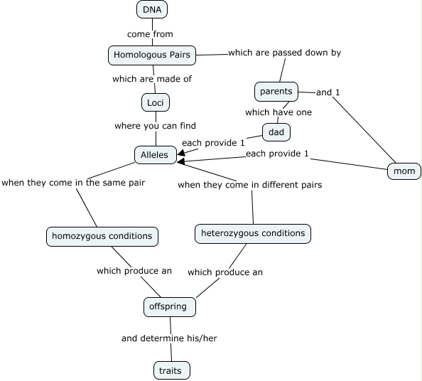This Concept Map, created with IHMC CmapTools, has information related to: Inheritance Terms, heterozygous conditions which produce an offspring, Homologous Pairs which are passed down by parents, Homologous Pairs which are made of Loci, Alleles when they come in different pairs heterozygous conditions, parents which have one dad, Alleles when they come in the same pair homozygous conditions, parents and 1 mom, dad each provide 1 Alleles, homozygous conditions which produce an offspring, DNA come from Homologous Pairs, mom each provide 1 Alleles, Loci where you can find Alleles, offspring and determine his/her traits