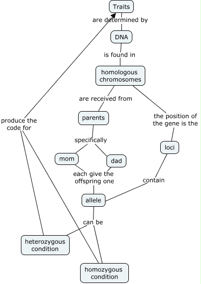 This Concept Map, created with IHMC CmapTools, has information related to: Inheritance, DNA is found in homologous chromosomes, allele can be heterozygous condition, dad each give the offspring one allele, heterozygous condition produce the code for Traits, homozygous condition produce the code for Traits, parents specifically dad, mom each give the offspring one allele, loci contain allele, homologous chromosomes are received from parents, parents specifically mom, homologous chromosomes the position of the gene is the loci, Traits are determined by DNA, allele can be homozygous condition