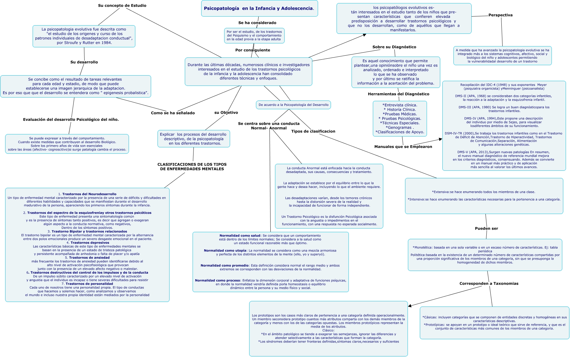 Este Cmap, tiene información relacionada con: Mapa__ Conceptual Psicopatología Infancia - Adolescencia, Durante las últimas décadas, numerosos clínicos e investigadores interesados en el estudio de los trastornos psicológicos de la infancia y la adolescencia han consolidado diferentes técnicas y enfoques. Sobre su Diagnóstico Es aquel conocimiento que permite plantear,una opiniónsobre el niño una vez es analizado, ordenado e interpretado lo que se ha observado y por último se ratifica la información a la acertación del problema., Psicopatología en la Infancia y Adolescencia. Se ha considerado Por ser el estudio, de los trastornos del Psiquismo y el comportamiento en la edad previa a la etapa adulta, Durante las últimas décadas, numerosos clínicos e investigadores interesados en el estudio de los trastornos psicológicos de la infancia y la adolescencia han consolidado diferentes técnicas y enfoques. Tipos de clasificacion *Extensiva: se hace enumerando todos los miembros de una clase. *Intensiva: se hace enumerando las características necesarias para la pertenencia a una categoría., los psicopatólogos evolutivos es- tán interesados en el estudio tanto de los niños que pre- sentan características que confieren elevada predisposición a desarrollar trastornos psicológicos y que no los desarrollan, como de aquéllos que llegan a manifestarlos. Perspectiva A medida que ha avanzado la psicopatologia evolutiva se ha integrado más a los sistemas cognitivos, afectivo, social y biológico del niño y adolescentes permitiendo la vulnerabilidadal desarrollo de un trastorno, De acuerdo a la Psicopatología del Desarrollo Se centra sobre una conducta Normal- Anormal Normalidad como salud: Se considera que un comportamiento está dentro de los límites normales; Se considera a la salud como un estado funcional razonable más que óptimo. Normalidad como utopía: La normalidad se considera como una mezcla armoniosa y perfecta de los distintos elementos de la mente (ello, yo y superyó). Normalidad como promedio: Esta definición considera normal el rango medio y ambos extremos se corresponden con las desviaciones de la normalidad. Normalidad como proceso: Enfatiza la dimensión corporal y adaptativa de funciones psíquicas, en donde la normalidad vendría definida porla homeostasis o equilibrio dinámico entre la persona y su medio físico y social., Se concibe como el resultado de tareas relevantes para cada edad y estadio, de modo que puede establecerse una imagen jerarquica de la adaptacion. Es por eso que que el desarrollo se entendera como " epigenesis probalistica". Como se ha señalado los psicopatólogos evolutivos es- tán interesados en el estudio tanto de los niños que pre- sentan características que confieren elevada predisposición a desarrollar trastornos psicológicos y que no los desarrollan, como de aquéllos que llegan a manifestarlos., La psicopatologia evolutiva fue descrita como "el estudio de los origenes y curso de los patrones individuales de desadaptacion conductual", por Stroufe y Rutter en 1984. Su desarrollo Se concibe como el resultado de tareas relevantes para cada edad y estadio, de modo que puede establecerse una imagen jerarquica de la adaptacion. Es por eso que que el desarrollo se entendera como " epigenesis probalistica"., Explicar los procesos del desarrollo descriptivo, de la psicopatología en los diferentes trastornos. CLASIFICACIONES DE LOS TIPOS DE ENFERMEDADES MENTALES 1. Trastornos del Neurodesarrollo Un tipo de enfermedad mental caracterizado por la presencia de una serie de déficits y dificultades en diferentes habilidades y capacidades que se manifiestan durante el desarrollo madurativo de la persona, apareciendo los primeros síntomas durante la infancia. 2. Trastornos del espectro de la esquizofreniay otros trastornos psicóticos Este tipo de enfermedad presenta una sintomatología común y es la presencia de síntomas tanto positivos, es decir que agregan o exageran algún aspecto a la conducta normativa, como negativos, Dentro de los síntomas positivos. 3. Trastorno Bipolar y trastornos relacionados El trastorno bipolar es un tipo de enfermedad mental caracterizada por la alternancia entre dos polos emocionales produce un severo desgaste emocional en el paciente. 4. Trastornos depresivos Las características básicas de este tipo de enfermedades mentales se basan en la presencia de un estado de tristeza patológica y persistente acompañada de anhedonia o falta de placer y/o apatía 5. Trastornos de ansiedad más frecuente los trastornos de ansiedad pueden identificarse debido al alto nivel de activación psicofisiológica que provocan junto con la presencia de un elevado afecto negativo o malestar. 6. Trastornos destructivos del control de los impulsos y de la conducta De un impulso súbito caracterizado por un elevado nivel de activación y angustia que el individuo es incapaz o tiene severas dificultades para resistir 7. Trastornos de personalidad Cada uno de nosotros tiene una personalidad propia. El tipo de conductas que hacemos y solemos hacer, como analizamos y observamos el mundo e incluso nuestra propia identidad están mediados por la personalidad, *Monotética: basada en una sola variable o en un escaso número de características. Ej: tabla periódica Politética: basada en la existencia de un determinado número de características compartidas por una proporción significativa de los miembros de una categoría, sin que se presuponga la homogeneidad de dichos miembros. Corresponden a Taxonomias Los prototipos son los casos más claros de pertenencia a una categoría definida operacionalmente. Un miembro se considera prototipo cuantos más atributos comparta con los demás miembros de la categoría y menos con los de las categorías opuestas. Los miembros prototípicos representan la media de los atributos. Clásico: *En el ámbito patológico se tiende a exagerar las semejanzas, ignorar las diferencias y atende